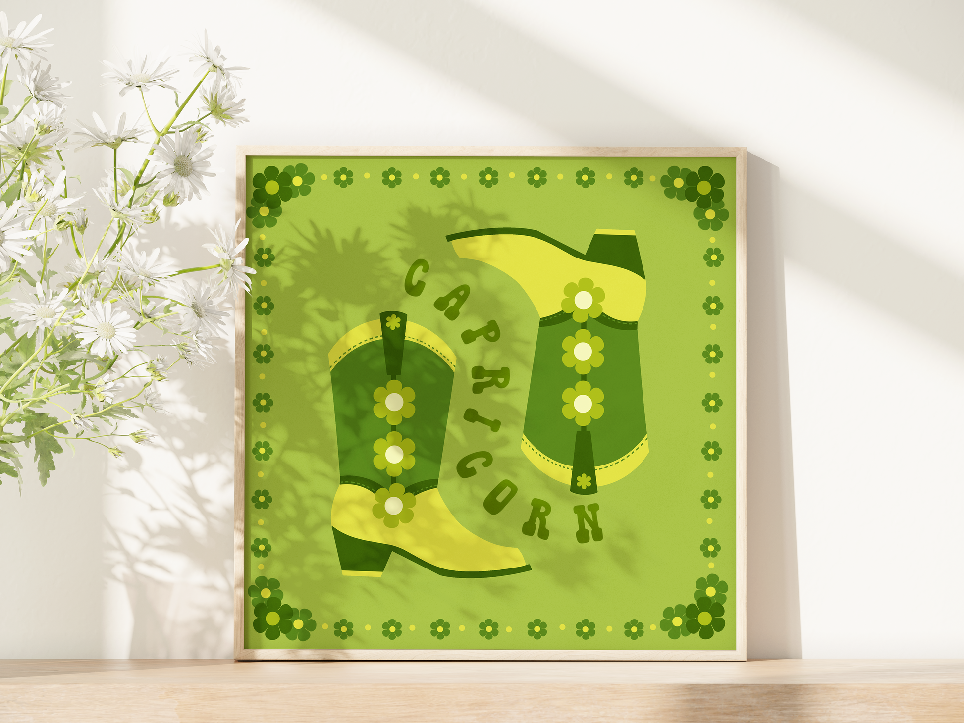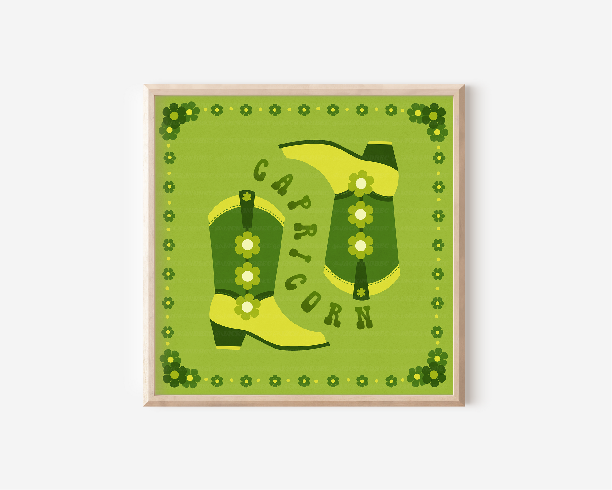 "Capricorn Boots” is printed on 8”x8” or 11”x11” Smooth Fine Art Archive paper.
