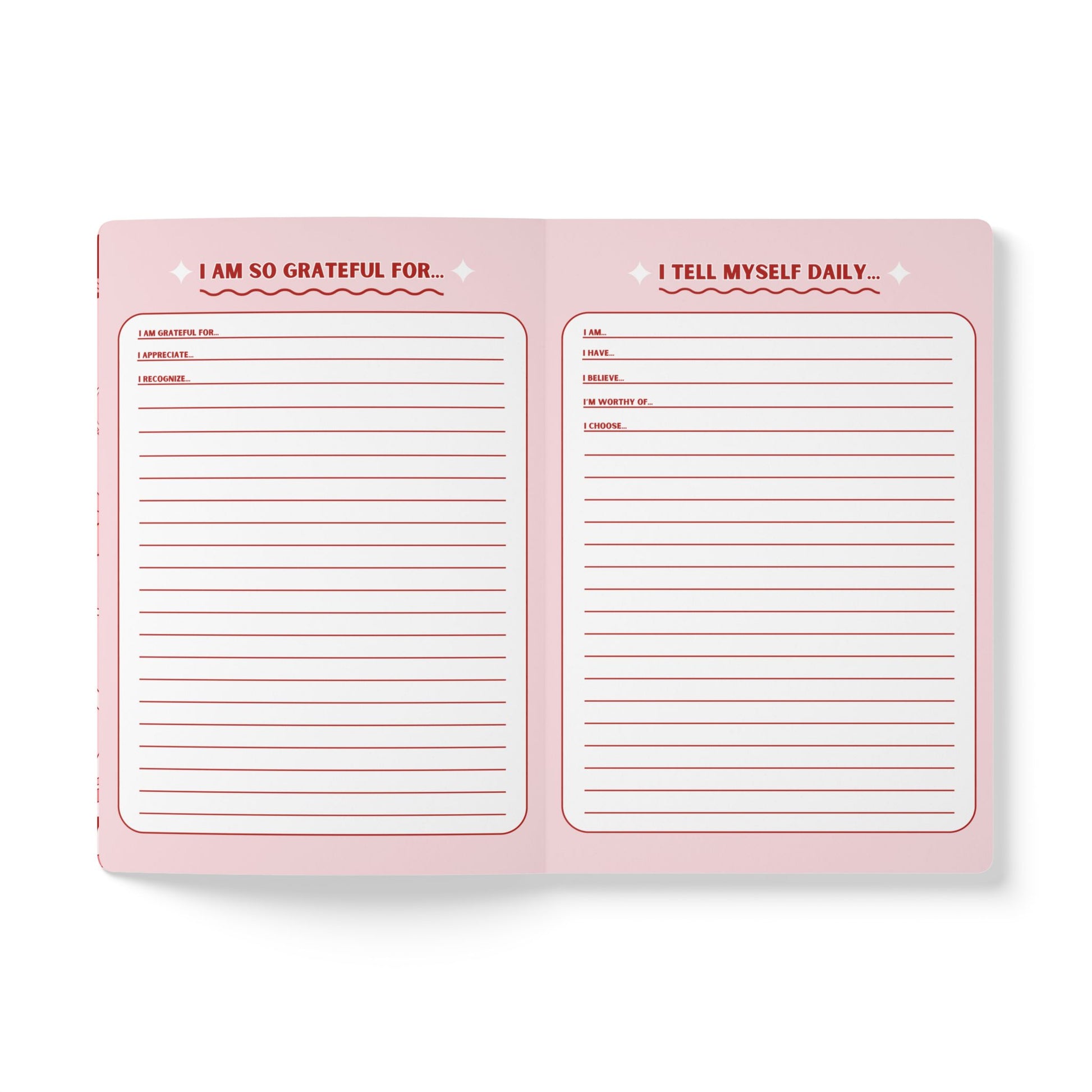 This soft cover journal comes perfectly sized at 5.75" x 8" (14.6 x 20.3 cm) and is available with 100 pages (50 sheets) to suit everyone's note-taking needs. The journal features a luxuriously soft satin finish cover with rounded corners for a sophisticated touch. Inside, is 3 pages. A gratitude page, affirmation page, and a manifestation page.