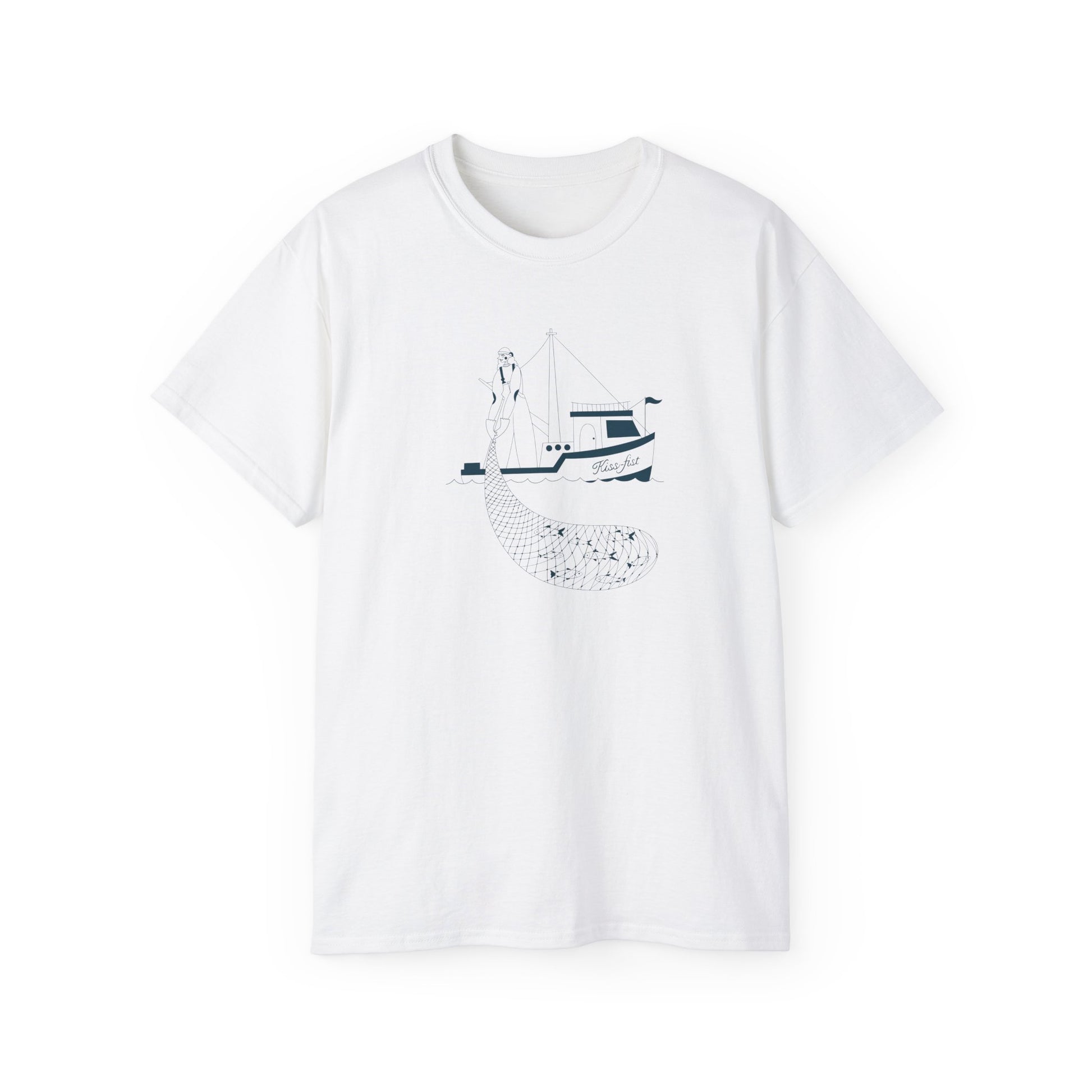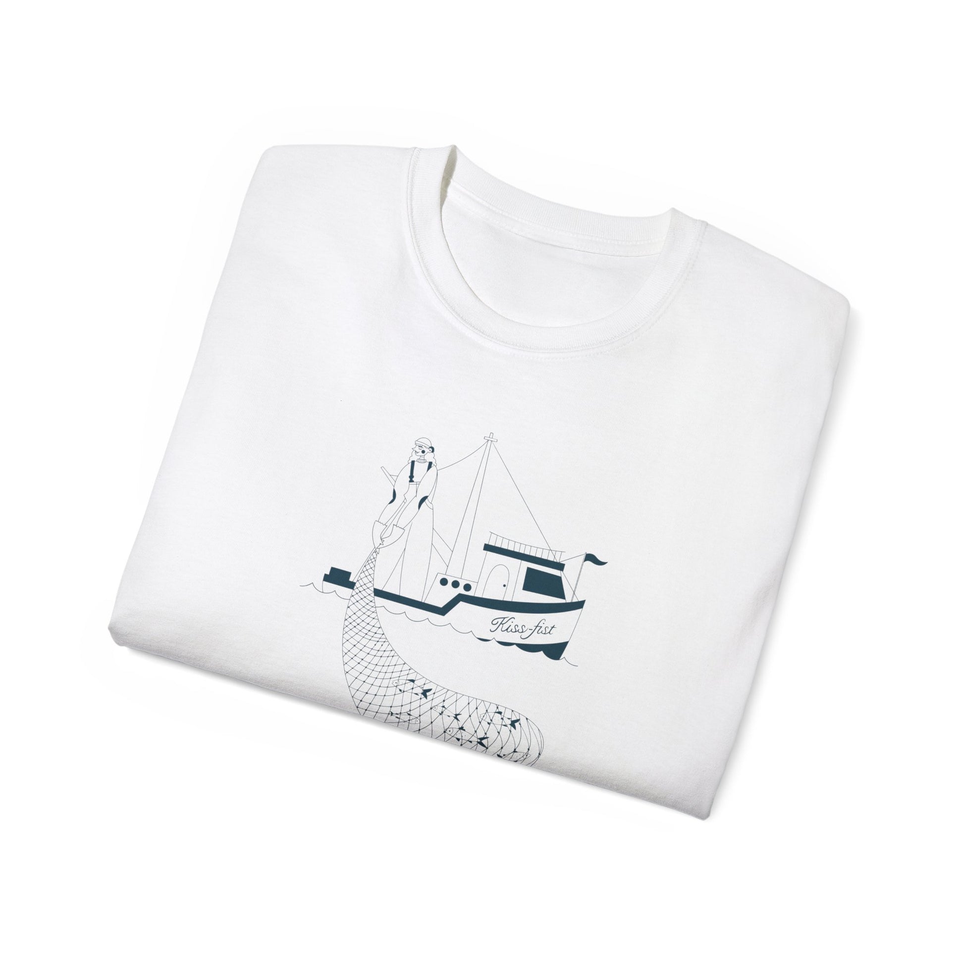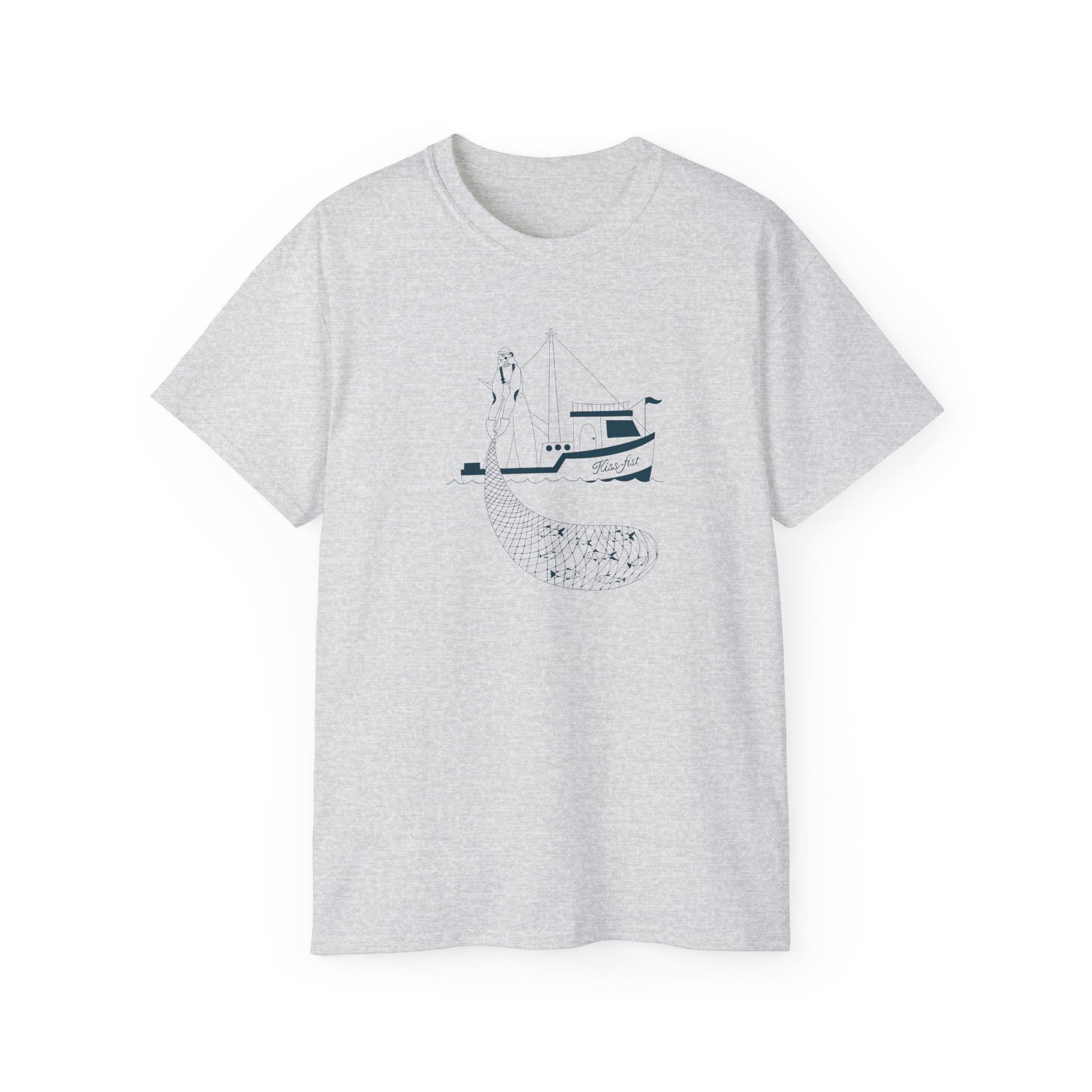 The kiss-fist t-shirt features a unique indigo blue line drawing of a deaf fisherwoman with hearing aids on her boat named the kiss-fist. This shirt is part of our Martha’s Vineyard sign language collection for deaf awareness month, paying tribute to the historical significance of the island. Available in white, light blue, and ash gray, this unisex tee runs bigger than usual, providing extra comfort. It is made with environmentally-friendly cotton for a vintage feel and is suitable for everyday wear. The classic fit and crew neckline make it a versatile choice for casual and semi-formal occasions.