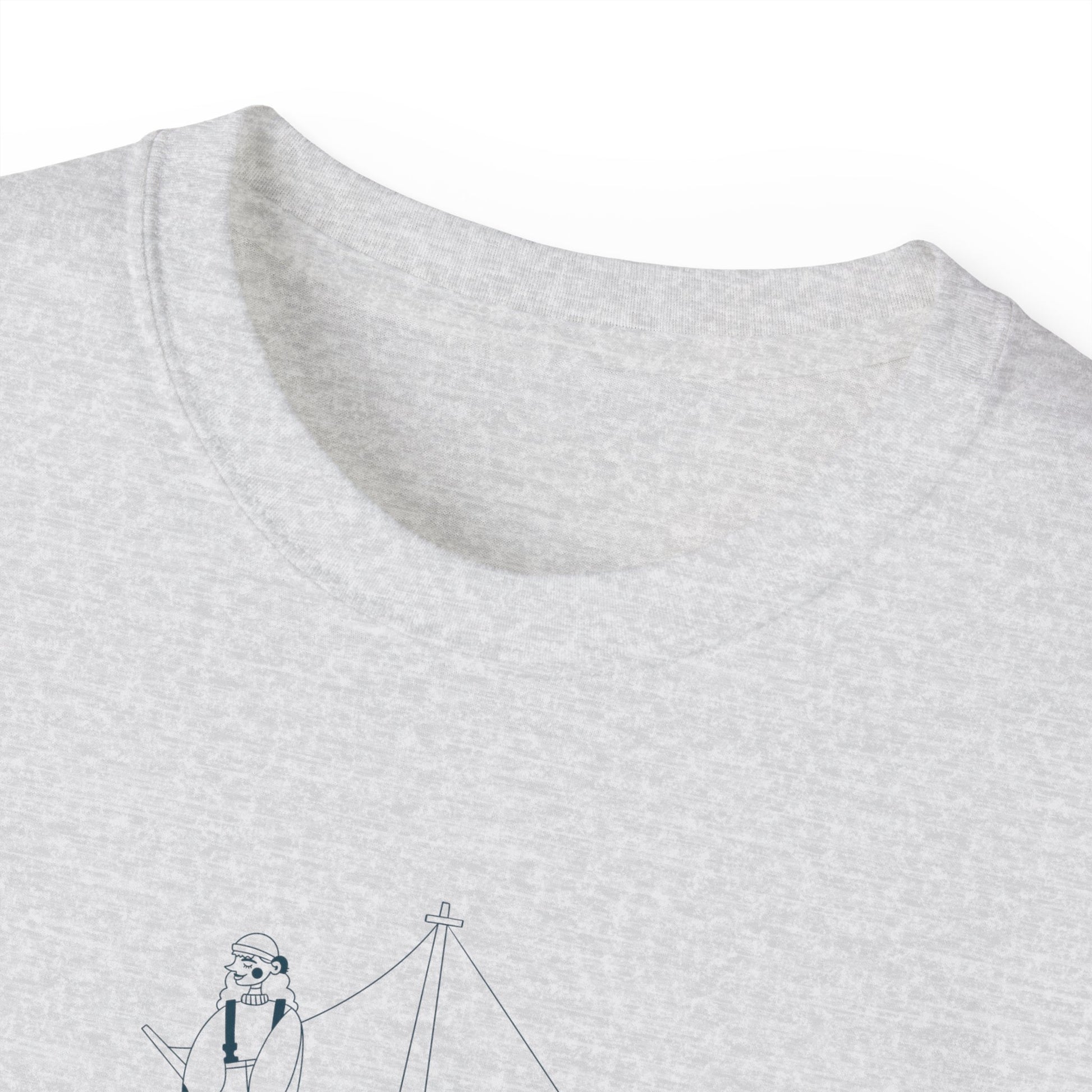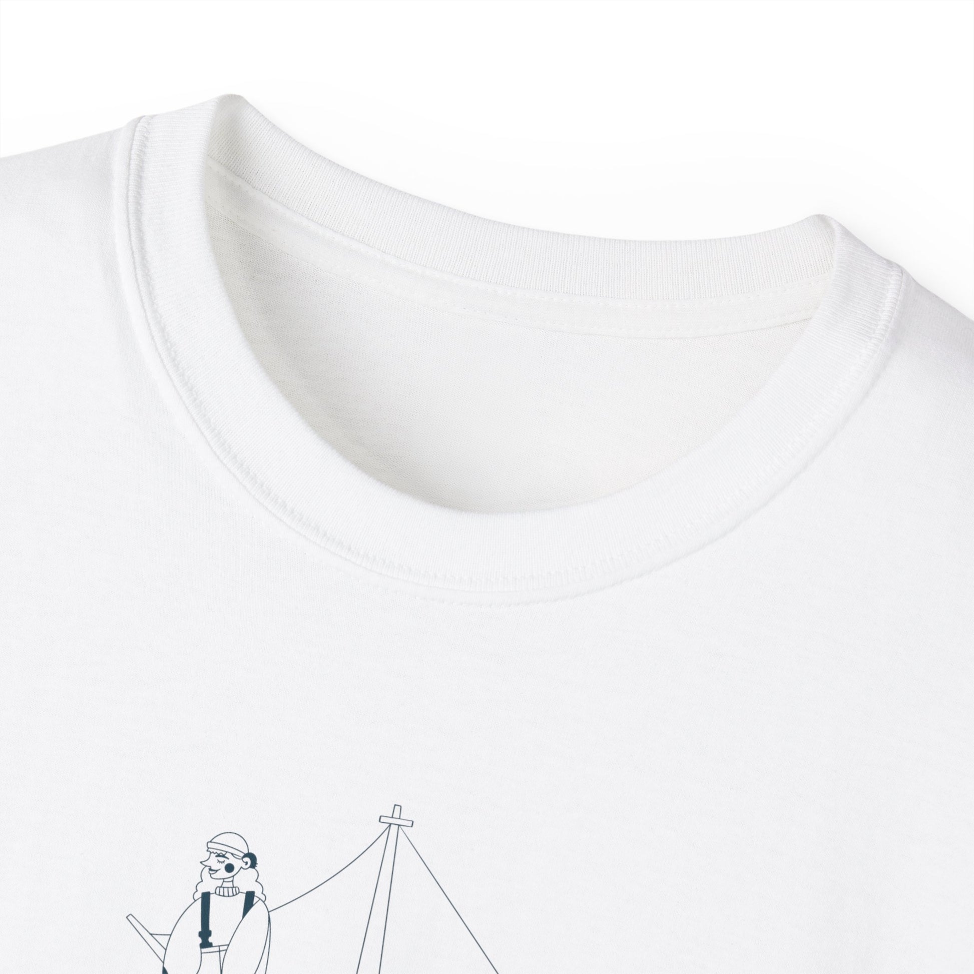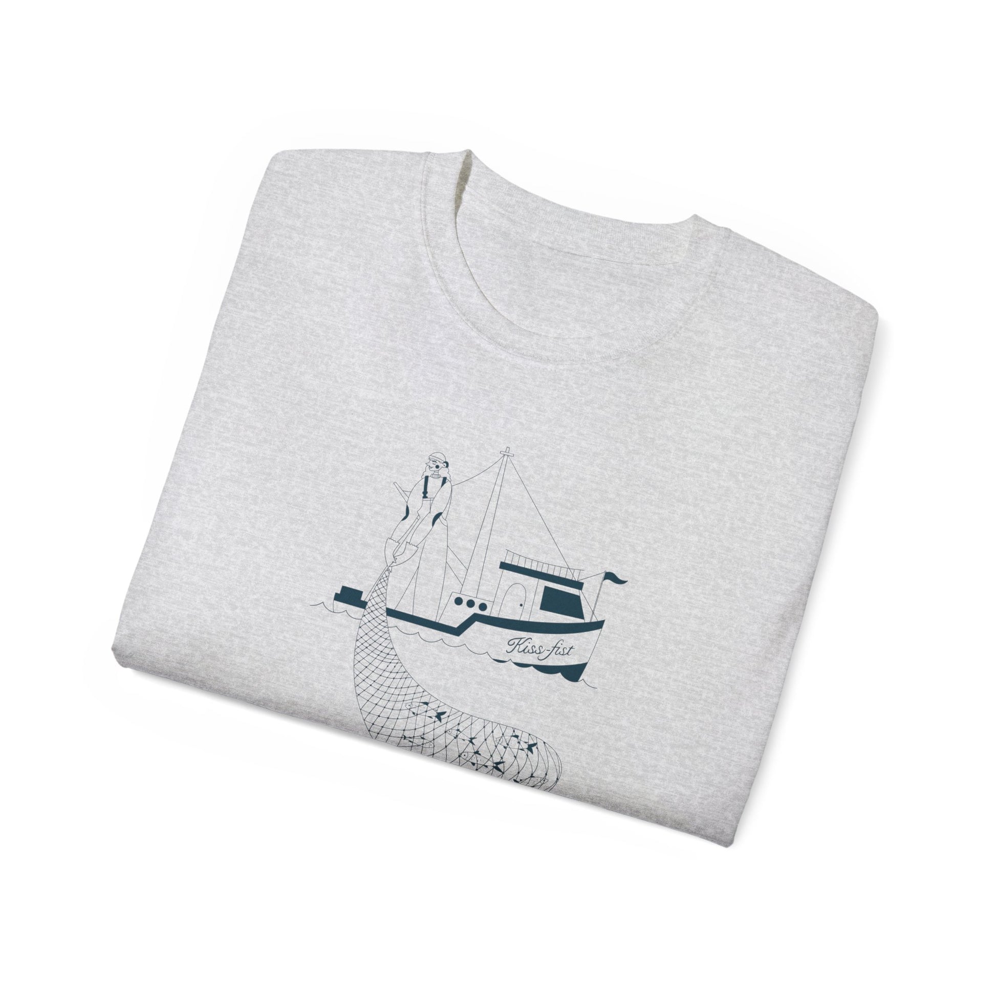 The kiss-fist t-shirt features a unique indigo blue line drawing of a deaf fisherwoman with hearing aids on her boat named the kiss-fist. This shirt is part of our Martha’s Vineyard sign language collection for deaf awareness month, paying tribute to the historical significance of the island. Available in white, light blue, and ash gray, this unisex tee runs bigger than usual, providing extra comfort. It is made with environmentally-friendly cotton for a vintage feel and is suitable for everyday wear. The classic fit and crew neckline make it a versatile choice for casual and semi-formal occasions.