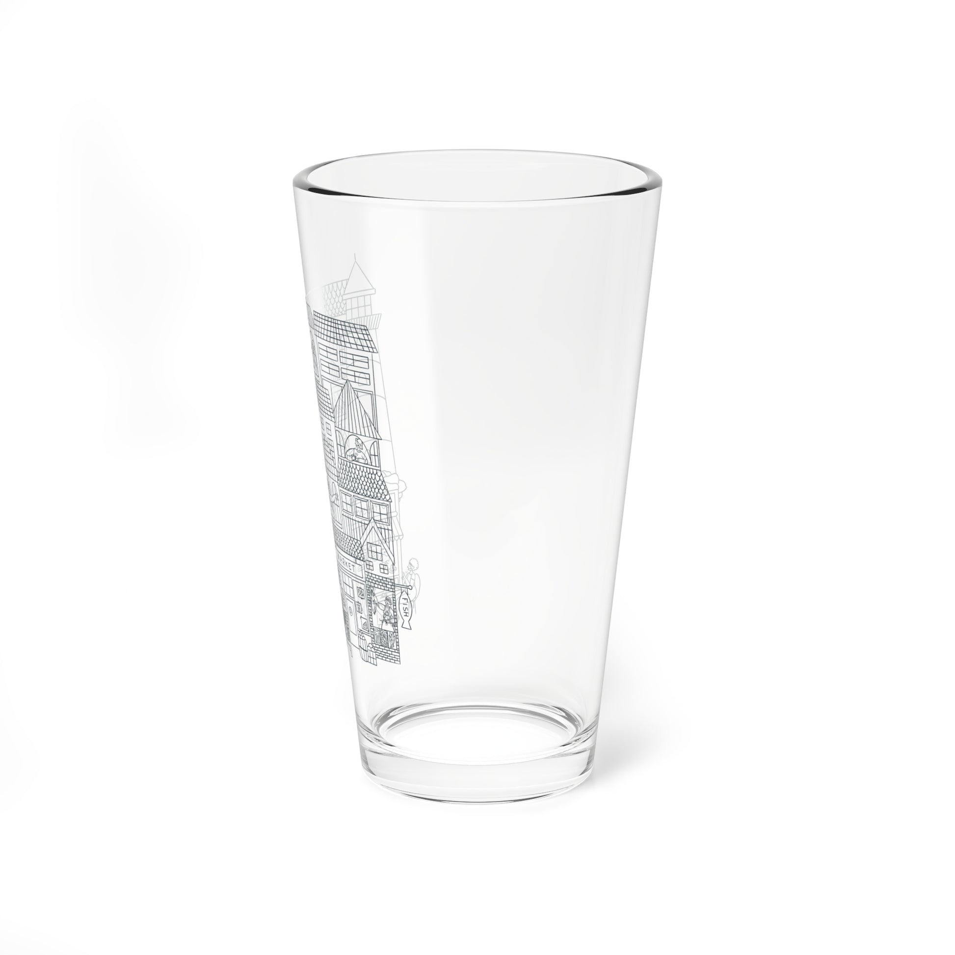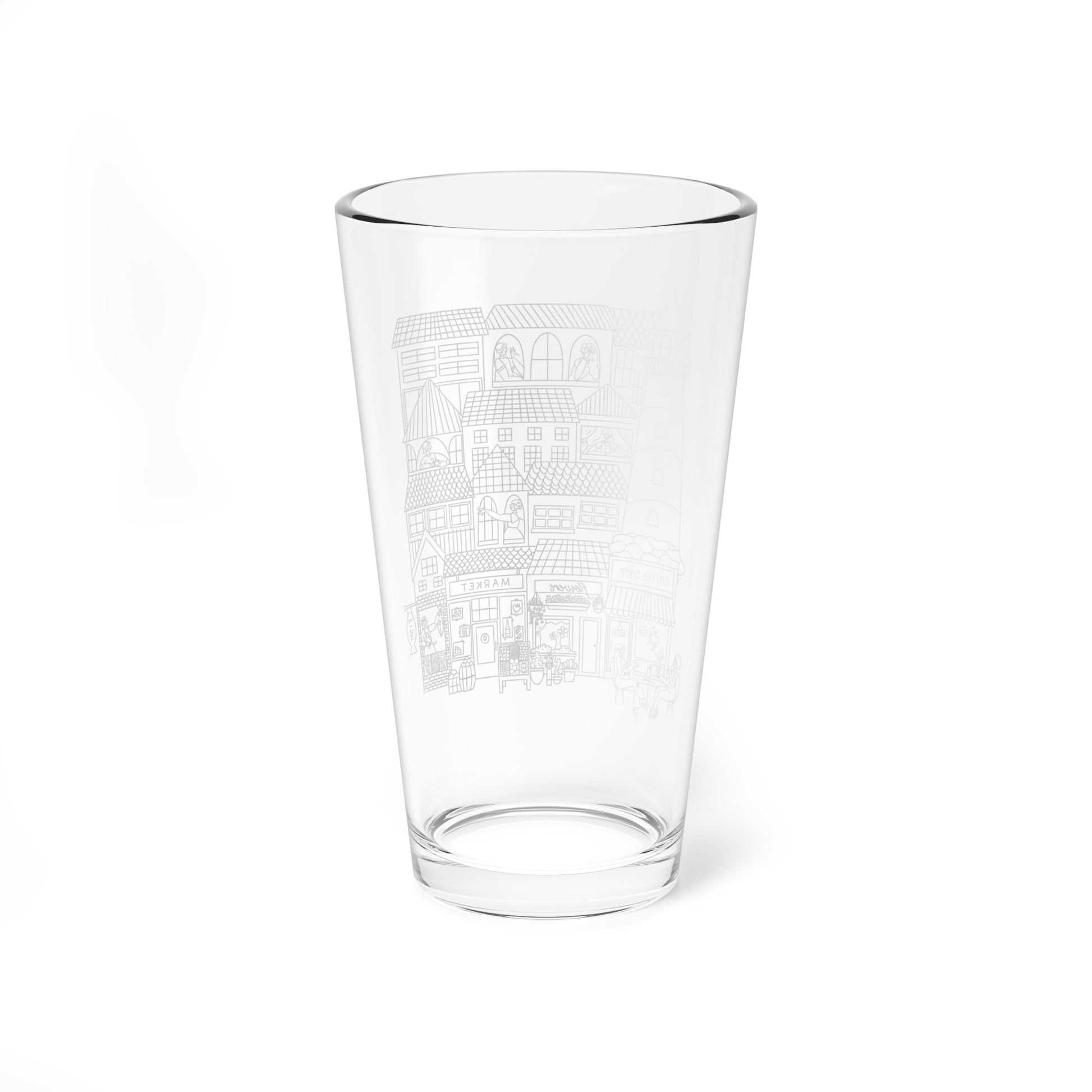 A glass featuring a line drawing of a Marthas Vineyard inspired beach town where all the people are deaf or hard of hearing. Some individuals are communicating in American Sign Language and some have hearing aids and cochlear implants. The design, printed in dark blue ink on a 16oz glass, celebrates deaf awareness month and the story of the deaf beach town of Marthas Vineyard. This unique and meaningful piece is perfect for those passionate about deaf advocacy and inclusivity.
